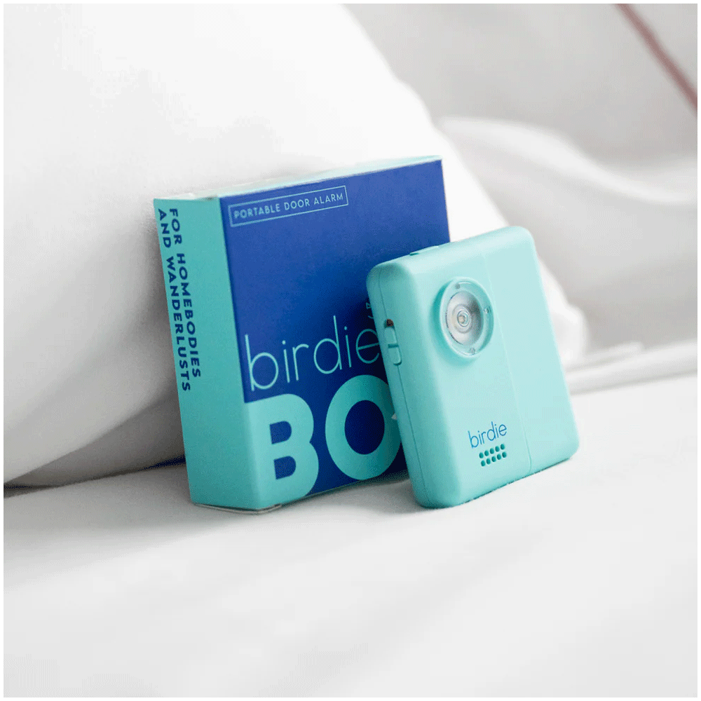 The Birdie Alarm Box is your own portable travel door alarm. Simply attach the Birdie Box to any door using the included Command Strips. When the door opens, Birdie's LOUD 130 db alarm will be activated. It's designed to deter attackers without needing to use force. We hope that you never have to use her, but you can feel safer knowing that you have Birdie Box on your door. A great gift for hotels, home rentals and dorm rooms. Available in three colors - aqua, blossom and coconut - each sold separately. It's rechargeable, has an ON/OFF switch and a flashlight