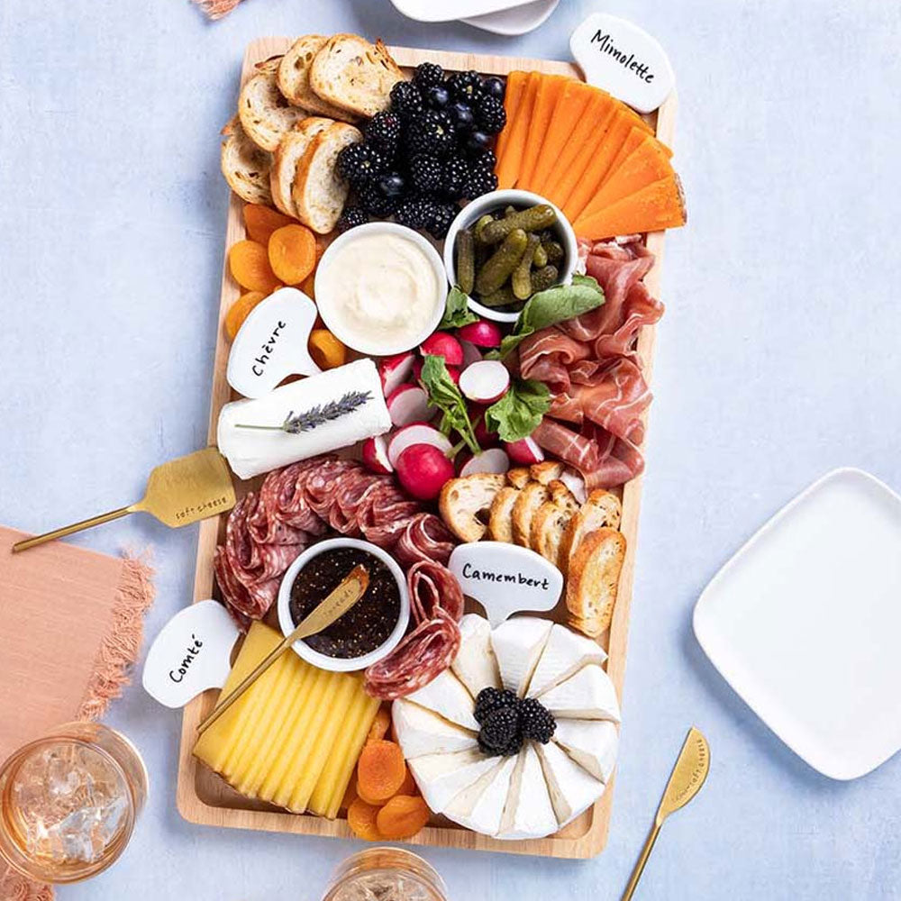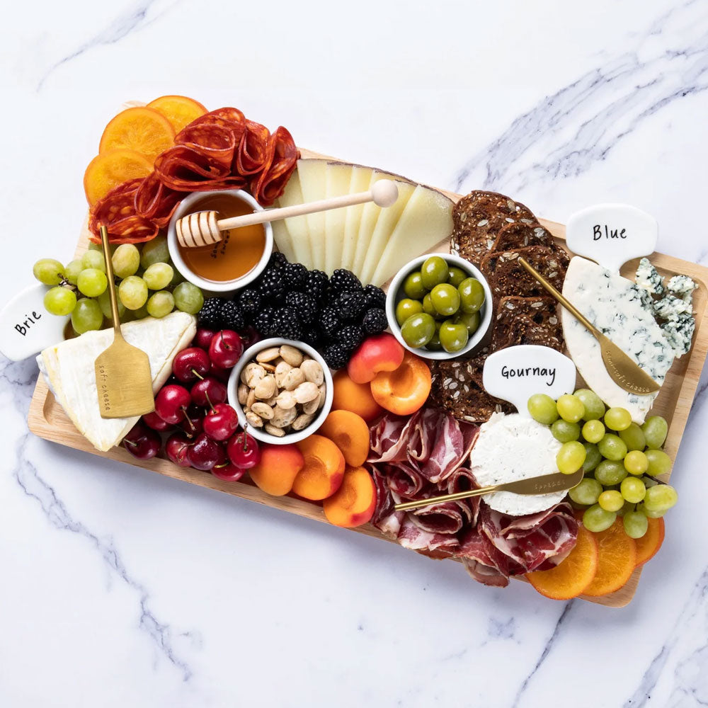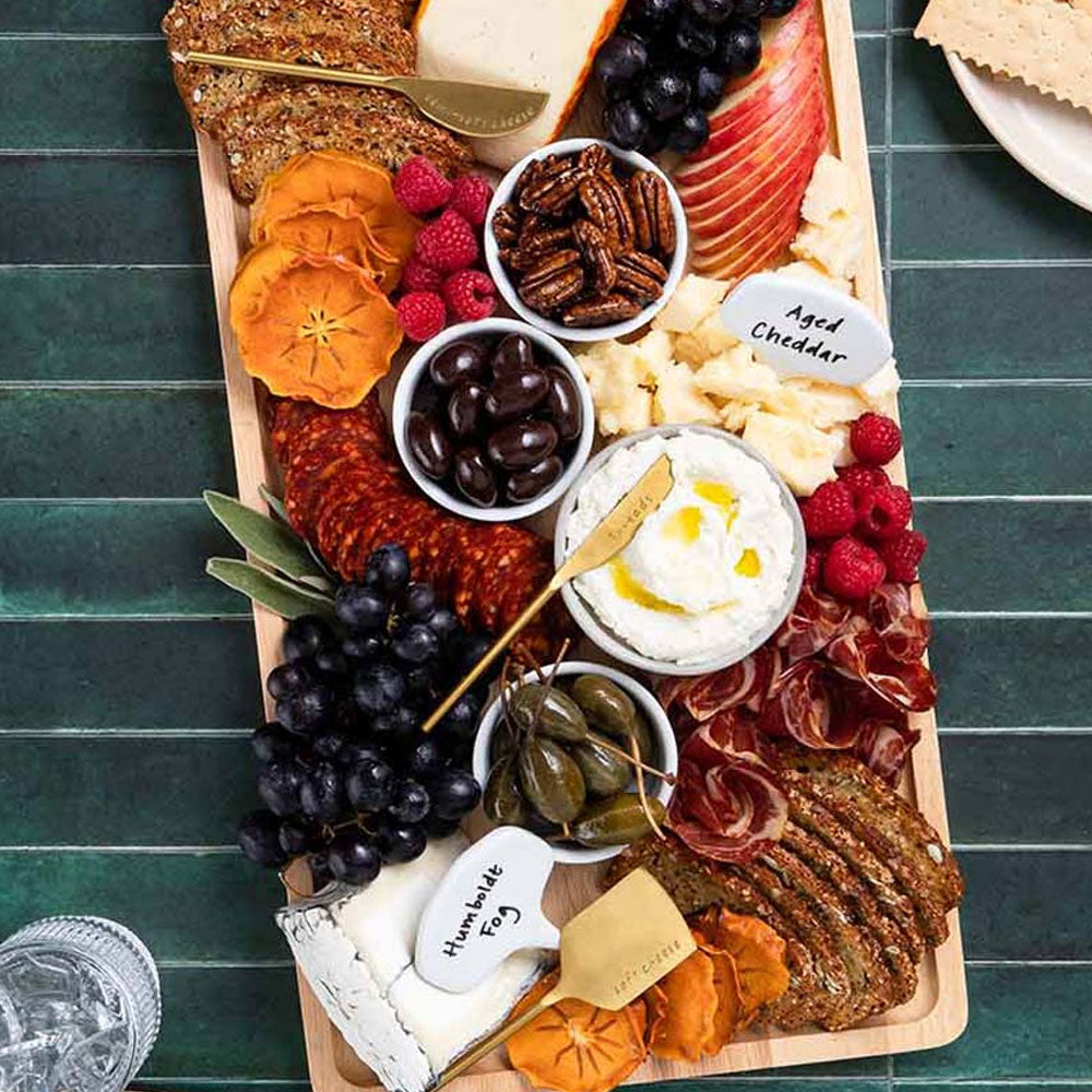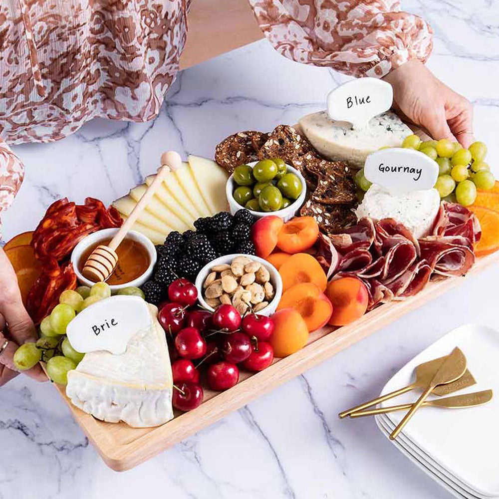 Premium 18 x 10” Board: This XL rubber wood cheese board features raised edges and an easy-to-clean, varnish finish making post-party cleanup a breeze.