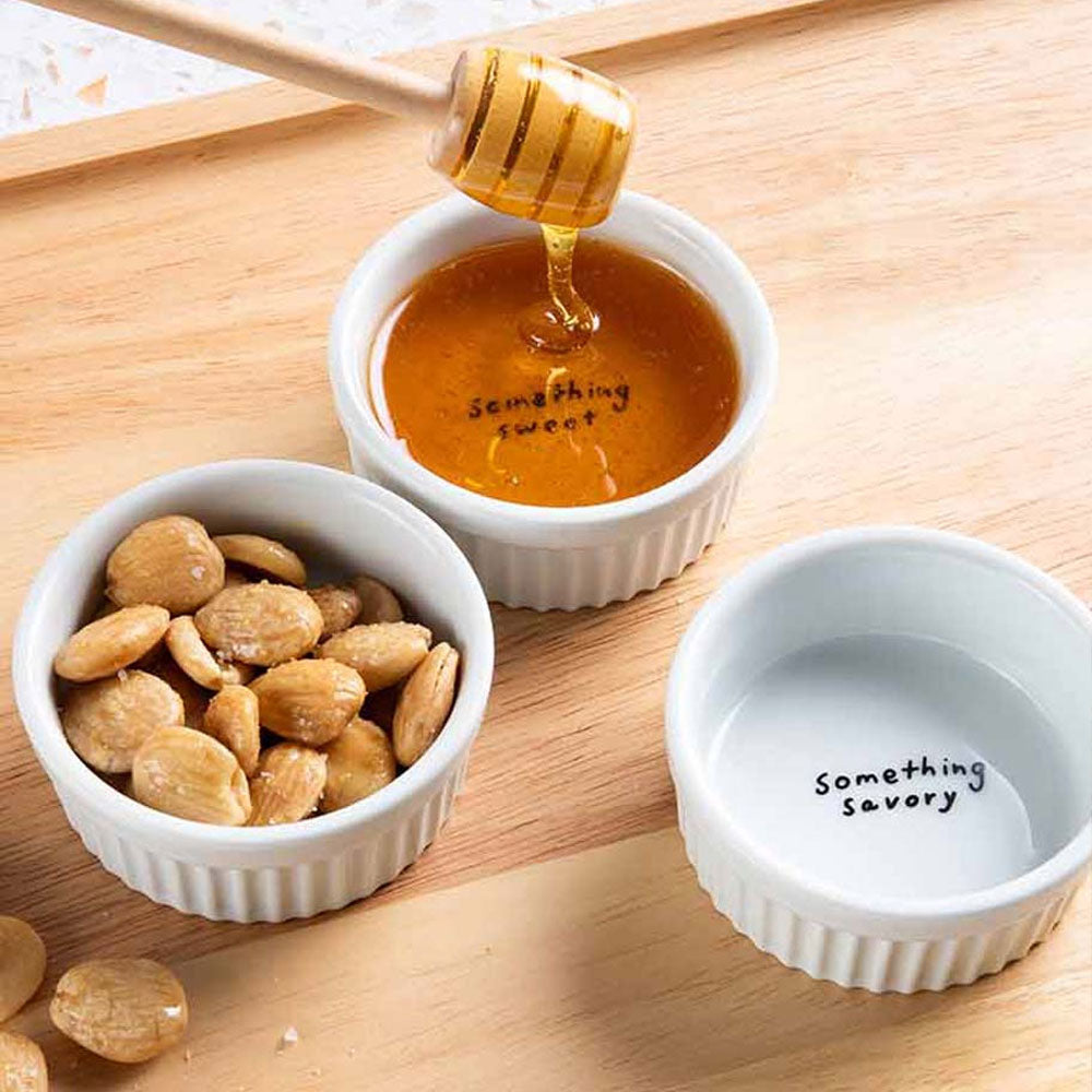 Three Large Ceramic Ramekins: These 3oz, stoneware ceramic ramekins have a glazed finish and are dishwasher, microwave, and oven safe up to 350 degrees. They feature charming decal words on the bottom, labeled 'something savory', 'something crunchy', and 'something sweet.'