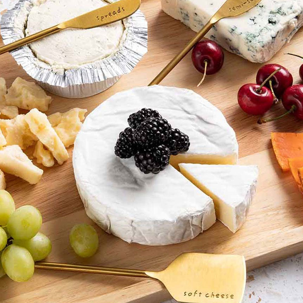 Three Gold Cheese Knives: Embossed with the labels 'soft cheese,' 'semi-soft cheese,' and 'spreads,' this set ensures you effortlessly match the right knife to each type of cheese. Each knife is approximately 5.5".