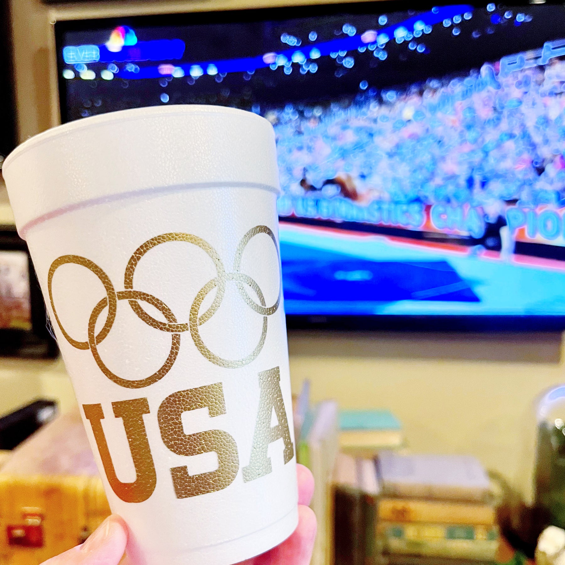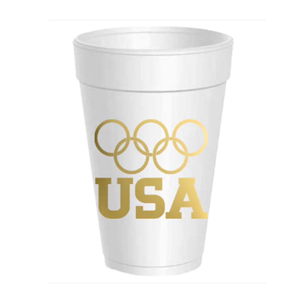 The perfect cups for watching the Olympics in Paris. Styrofoam cups printed in gold ink, of course! Sleeve of 10 cups.
