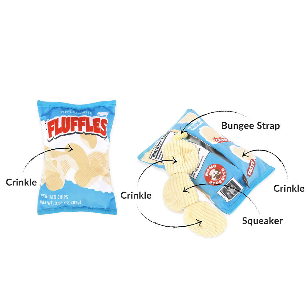 A bag of Fluffles for your pup might be the cutest thing ever! It's got different noises like a crinkle and squeaker, so it's great for stimulating your pup. It's a "seek and find" toy, so they can pull out the chips on a bungee cord attachment for even more delightful enjoyment. NOT INTENDED FOR AGGRESSIVE CHEWERS.