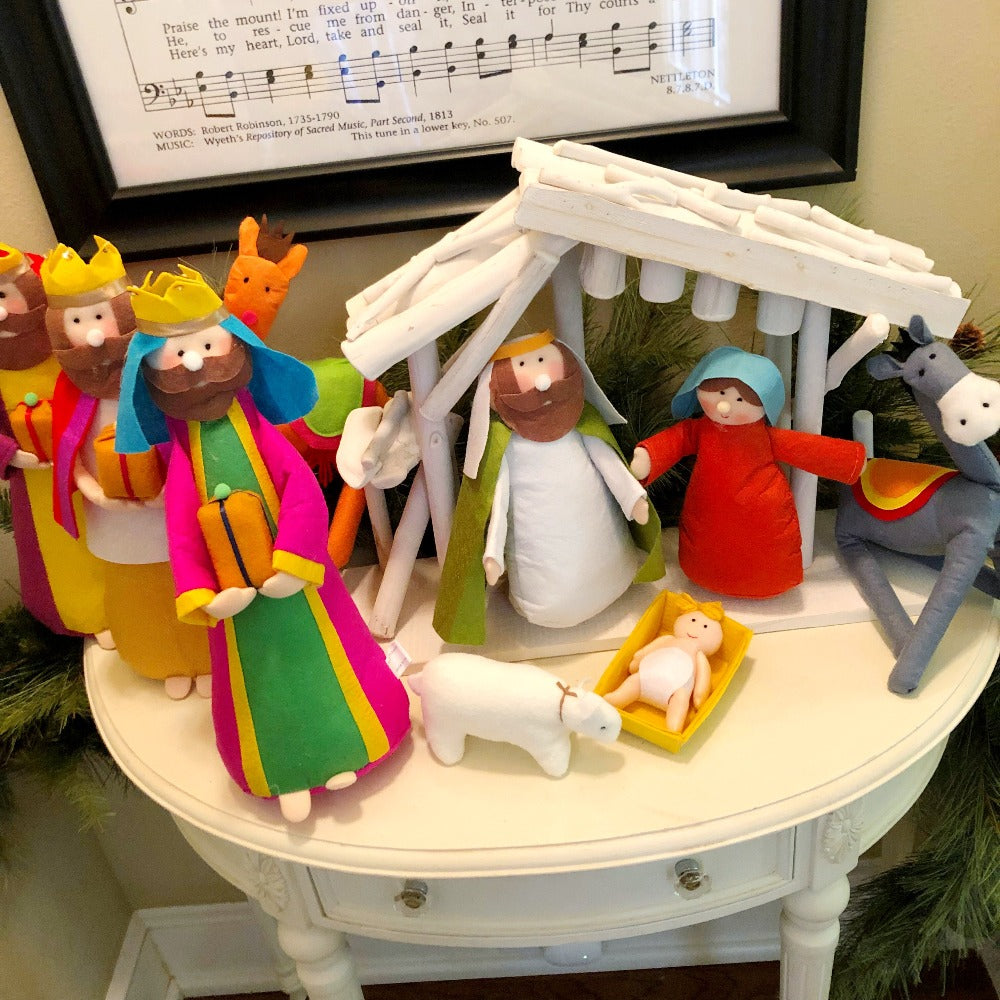 This colorful felt nativity set has been a customer favorite for years! It's large - 15.5" tall and includes 9 pieces - Mary, Joseph, Jesus, 3 Wise Mean, Camel, Donkey and Sheep.