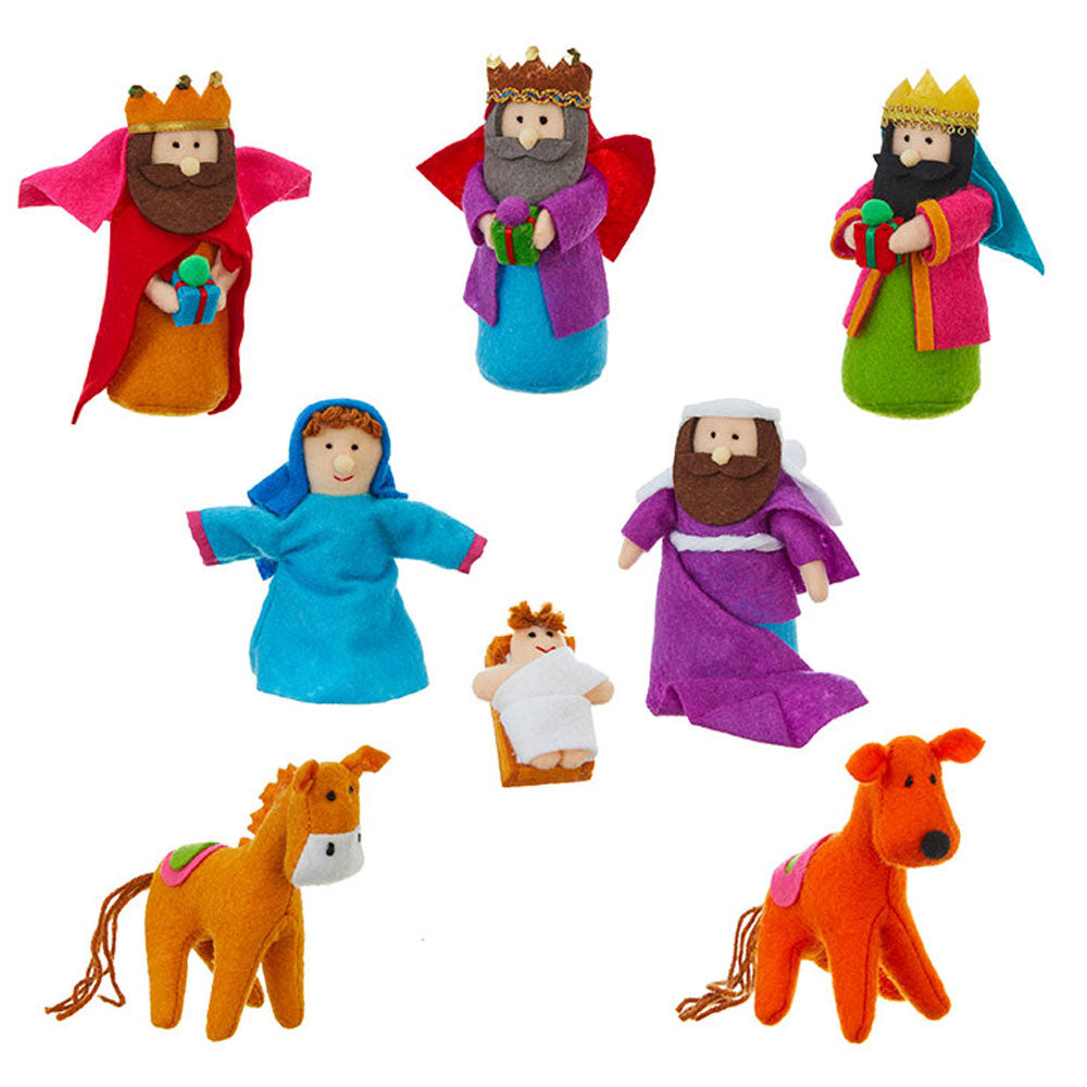 This small, colorful felt nativity set is new, but we know you'll love it if your Christmas decor is more traditional. It's 6" tall and includes 8 pieces - Mary, Joseph, Jesus, 3 Wise Mean, Camel and Donkey.