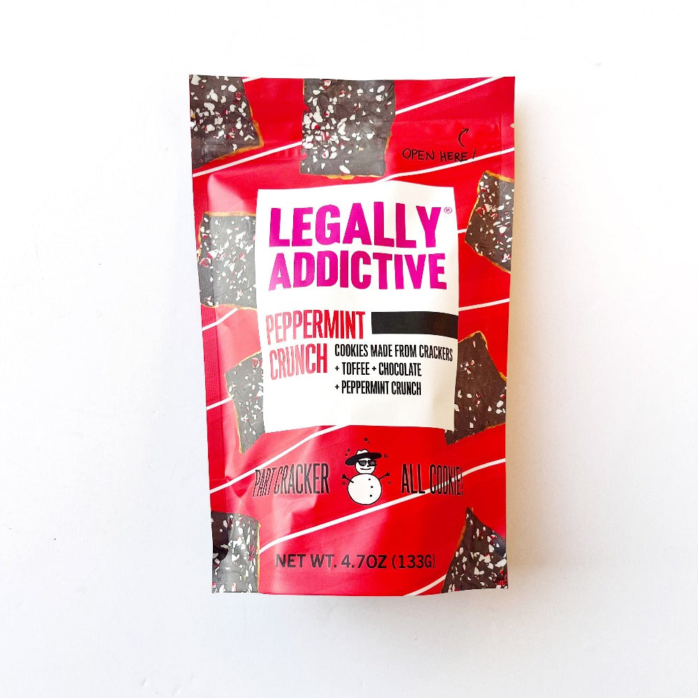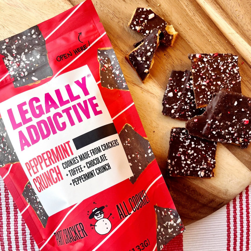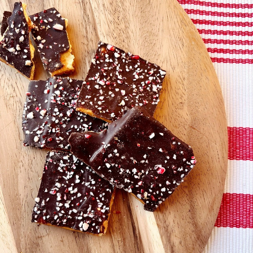 Ho-Ho-Hold on... these treats are legally addictive! This is a delicious combination, especially for the holidays: a crunchy cracker, covered in delicious handmade toffee and then topped with chocolate and crushed peppermint bits.