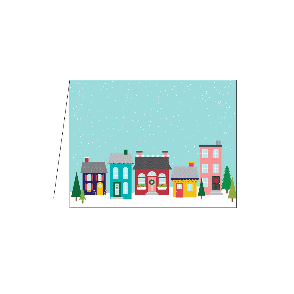 A petite, playful holiday card with a snowy town scene. Perfect for penning a thank you note or just a holiday greeting. Box of 20 folding cards and white envelopes. Printed on 100# white cardstock in Lubbock, Texas.