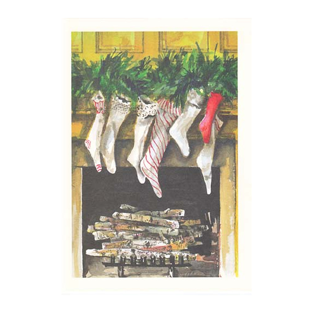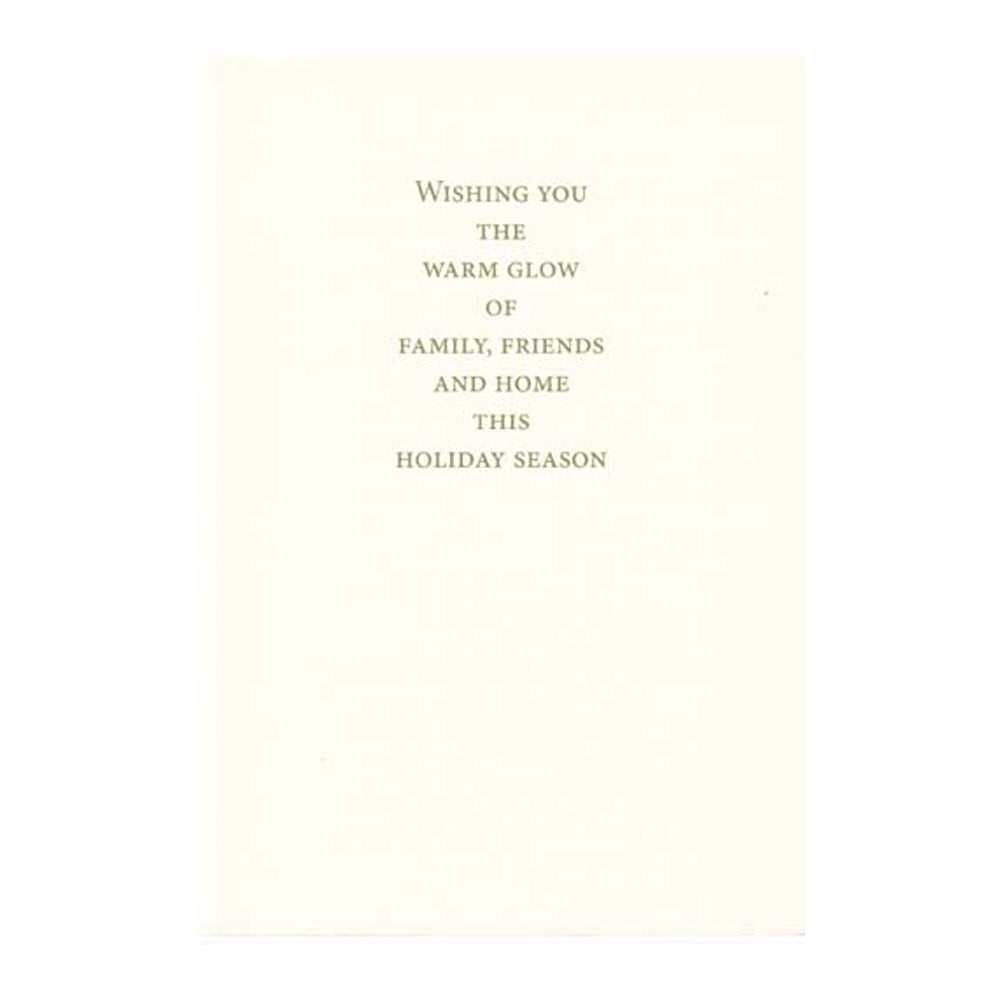 Beautiful, handpainted fireside artwork on a folded holiday card. Box of 10 folded cards with greeting inside: Wishing you the warm glow of family, friends and home this Holiday Season