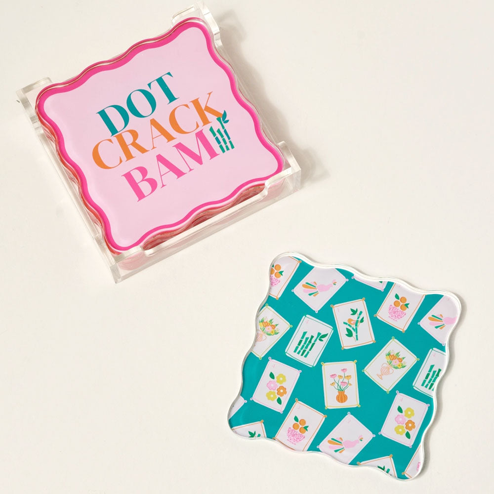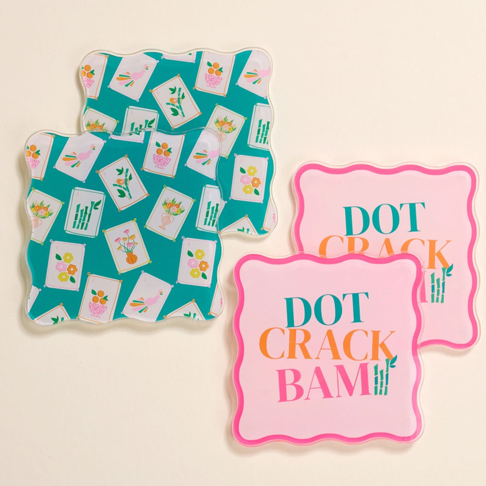 Thoughtfully created to merchandise beautifully other Mahjong merchandise, these acrylic coasters add a splash of personality to your table. Each piece features a bold, eye-catching design that adds color and character to your space. The sturdy acrylic base protects your surfaces from heat and moisture while keeping things stylish. Great for everyday use or entertaining, these coasters offer a simple way to refresh your décor and make your table feel more inviting. Set of four durable acrylic coasters with playful patterns and sayings Includes a clear display base for storage and showcasing. Vibrant, easy-to-clean finish made for everyday entertaining Adds personality and charm to coffee tables and bar carts. Perfect gift for hosts, housewarmings, or game nights.