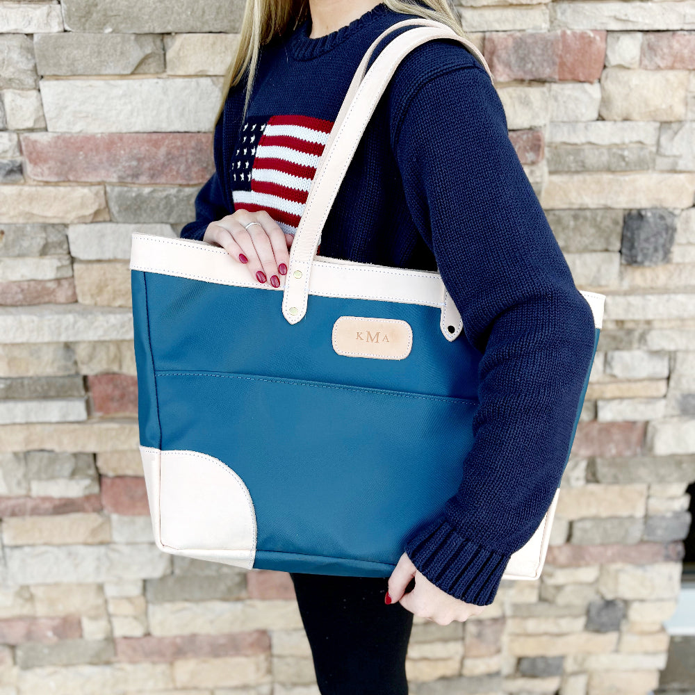 A large east-west tote with a wide bottom, the new Jon Hart print lining, two outside zippered pockets, three inside pockets, a quick-release key ring tether, heavy natural trim, a magnetic snap closure, and flat straps for comfortable over-the-shoulder carrying.